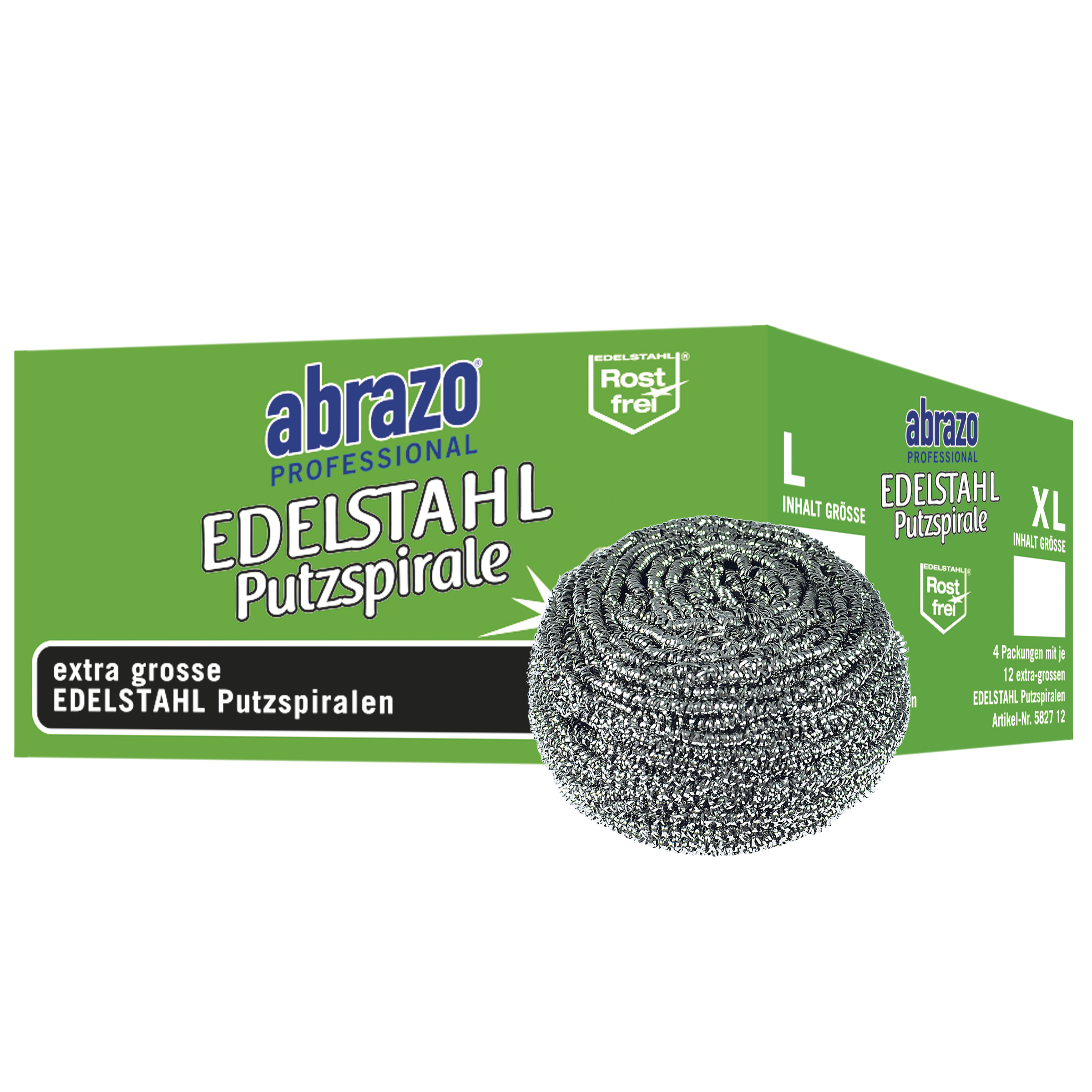 abrazo PROFESSIONAL EDELSTAHL-Putzspiralen repräsentieren einen hohen Qualitätsanspruch. Gefertigt werden die rostfreien EDELSTAHL-Putzspiralen nach der Spitzennorm AISI 434A. abrazo EDELSTAHL-Putzspiralen werden in den Größen 40g, 60g und 80g angeboten